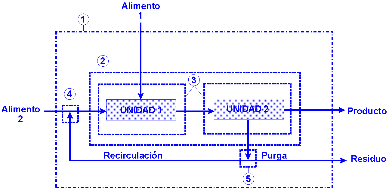 Diagrama de flujo: Representación simbólica de los diferentes componentes de un proceso, con objeto de organizar la información disponible de la forma más conveniente para efectuar los cálculos posteriores. Se representan operaciones (separadores, reactores) con bloques geométricos (rectángulos, círculos); se representan corrientes con líneas con flechas. Se suelen añadir los valores (con unidades) de las variables conocidas y símbolos algebraicos (con unidades) para las variables desconocidas. Sobre el diagrama de flujo se definen los límites del sistema, cuyo tamaño variará según las necesidades de cálculo (Figura 3.1):