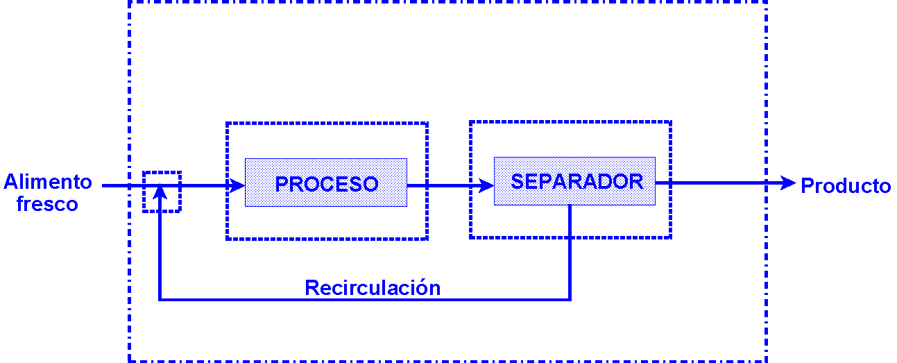 Derivacción ("bypass"): Corriente que se ha desviado de la principal para evitar que sufra una o más etapas de un proceso, llegando directamente a una etapa posterior para obtener una composición final deseada (Figura 3.2); se efectúa un balance alrededor de todo el sistema y un balance en el punto de mezcla. Recirculación ("recycle"): Corriente que se devuelve a la corriente de alimentación como resultado de una separación efectuada en la corriente de salida de un proceso para aprovechar disolventes valiosos o aumentar la conversión de reacciones reversibles (Figura 3.3); se efectúa un balance alrededor de todo el sistema, alrededor de cada bloque y en el punto de mezcla. |