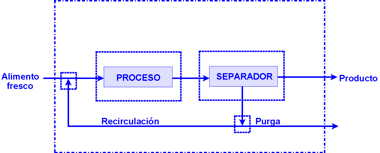 | Purga ("purge"): Corriente desviada de una recirculación hacia el exterior del sistema, con objeto de eliminar ciertas sustancias que de otra manera se acumularían en el interior del sistema (Figura 3.4); se efectúa un balance alrededor de todo el sistema, alrededor de cada bloque, en el punto de mezcla y en el de extracción de la purga. |