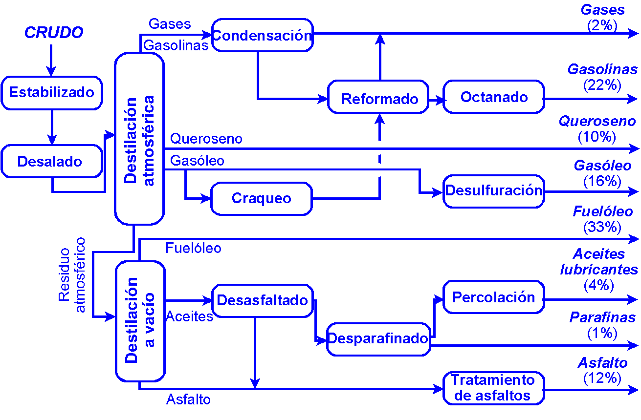 Separación de fracciones según su punto de ebullición por rectificación continua en columnas de platos o campanas. Destilación atmosférica: Primera etapa (360-400ºC) en la que se obtienen las "fracciones ligeras" (gases, gasolina, queroseno y gasóleo). Destilación a vacío: Segunda etapa (430ºC, 40-130 mmHg) para obtener las "fracciones pesadas" (fuelóleo, aceites lubricantes, parafinas y asfalto). |