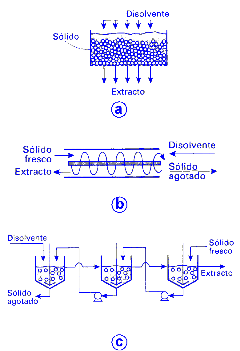El equipo que se utiliza en lixiviación es muy variado, ya que la operación puede llevarse a cabo por cargas, en semicontinuo o en continuo, en función del sistema involucrado en la separación. Si se atiendo a la forma de manipular la fase sólida, la lixiviación puede realizarse en: