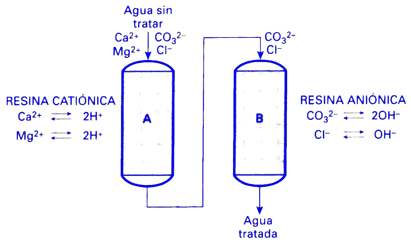 El intercambio iónico se aplica principalmente al tratamiento de aguas, utilizando de forma consecutiva resinas de intercambio catiónico y de intercambio aniónico. La operación se lleva a cabo haciendo pasar la alimentación por sendos lechos fijos de resinas catiónica y aniónica dispuestos en el interior de columnas. Una vez agotadas las resinas, deben regenerarse mediante tratamiento con una disolución concentrada que contenga el ion original. |