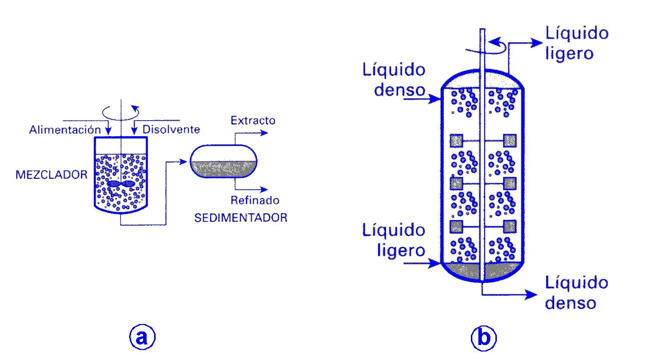 La extracción tiene lugar en extractores, en los que puede utilizarse agitación mecánica o en los que la agitación se puede producir por la propia circulación de los fluidos; una vez puestas en contacto íntimo las fases para conseguir la transferencia de materia, se procede a su separación. Entre los equipos más utilizados se encuentran los de contacto discontinuo, dentro de los que se distinguen dos grandes grupos: