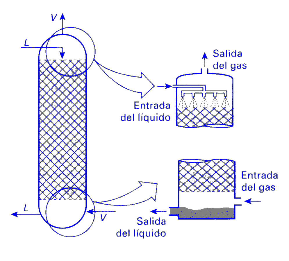 La absorción o la desabsorción se llevan a cabo habitualmente en columnas de relleno, aunque también pueden utilizarse columnas de platos (véase Destilación / Rectificación). Las columnas de relleno suelen ser cilindros de relación altura/diámetro elevada (alrededor de 10), llenas en su interior de elementos sólidos pequeños (menores que la octava parte del diámetro) distribuidos al azar o empaquetados e inertes a las fases circulantes. La corriente de líquido se rompe en pequeñas corrientes al caer sobre los elementos de relleno y se dispersa resbalando por su superficie en forma de película o gotas, lo que permite un íntimo contacto con la fase gaseosa que circula en sentido contrario. En el diseño de los rellenos se persigue el objetivo principal de lograr una elevada superficie por unidad de volumen, baja densidad y alta resistencia mecánica. |