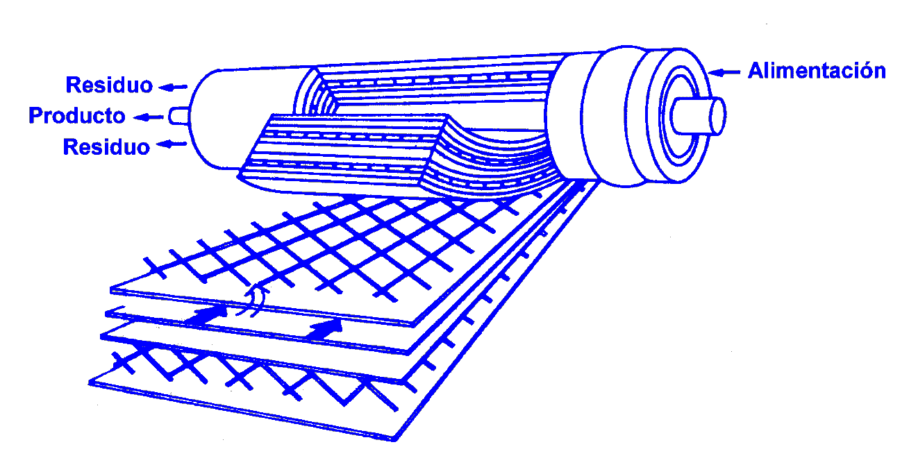 Existen diversos modelos de aparatos para llevar a cabo los procesos con membranas (de los cuáles el más utilizado es la ósmosis inversa), siendo los más extendidos los de difusión radial o cartuchos, ya que están formados por membranas planas, fáciles de fabricar, arrolladas en espiral formando un cilindro, lo que incrementa su relación superficie/volumen. La disolución que se va a separar entra por la periferia de uno de los extremos del cilindro y va circulando hacia el otro extremo. Durante su recorrido el disolvente atraviesa las membranas semipermeables migrando hacia el centro, por donde sale, mientras que la disolución concentrada no atraviesa las membranas y sale por la periferia. La separación entre las membranas que forman el cartucho se consigue con láminas espaciadoras impermeables y una rejilla. |