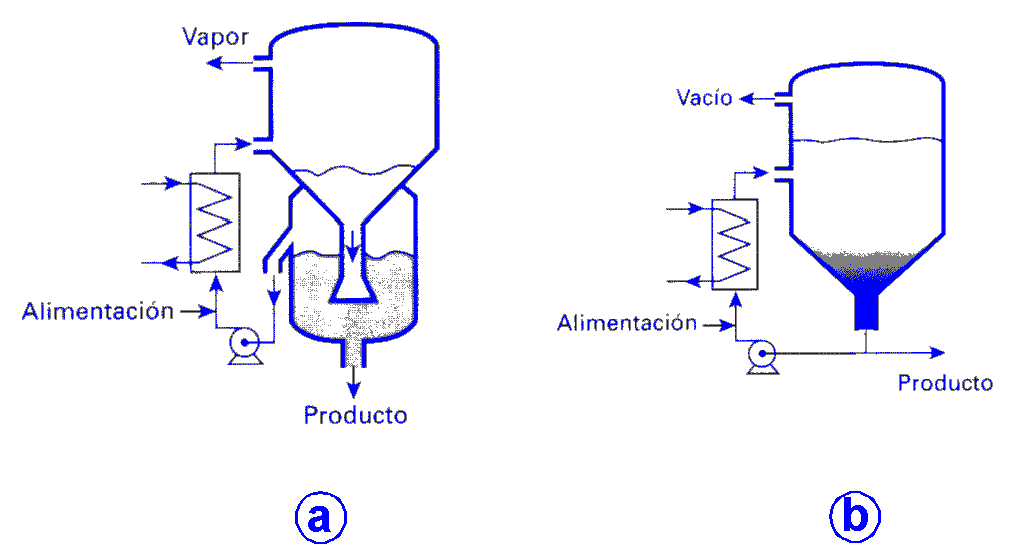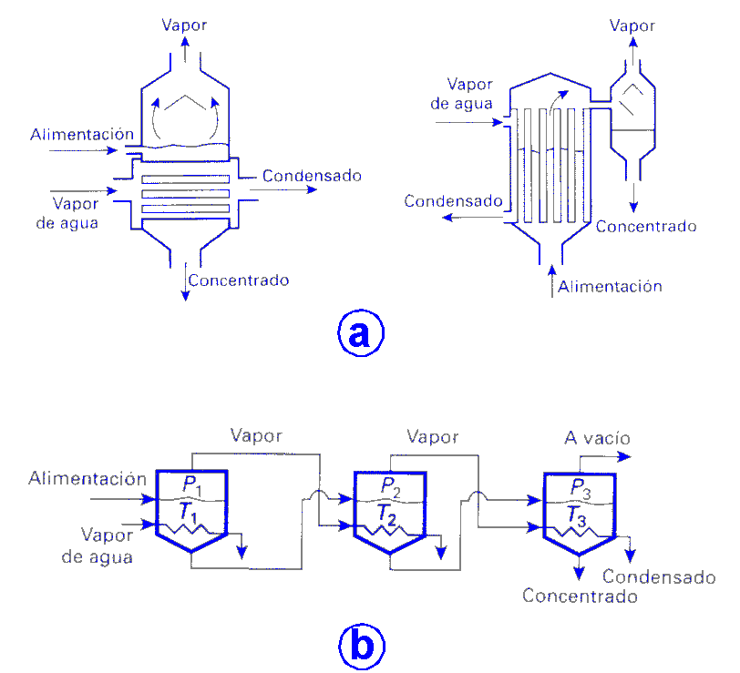 Esta operación se lleva a cabo en aparatos denominados evaporadores, cuyos tipos y condiciones de operación dependen de la disolución que se va a tratar. El calor, que controla el proceso, se suministra generalmente en forma de vapor de agua condensante en el interior de tubos sumergidos en la disolución. Generalmente la evaporación se lleva a cabo en varias etapas para mejorar el aprovechamiento energético ("múltiple efecto"): el vapor generado en un efecto se aprovecha en otro como medio de calefacción. |