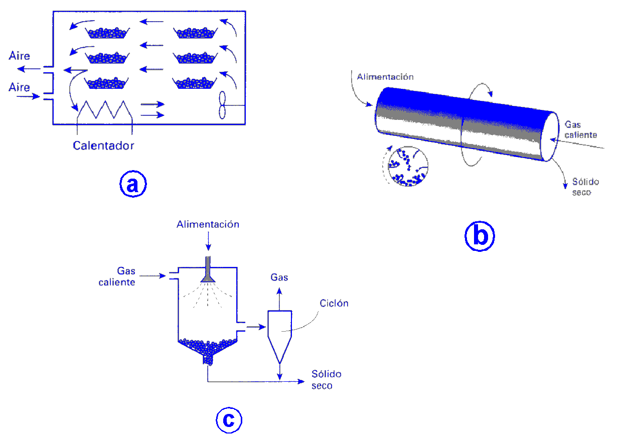 Hay muchos tipos de aparatos secadores, denominados genéricamente secaderos. Casi todos ellos están basados en poner en contacto el sólido húmedo finamente dividido con una corriente de aire caliente no saturado. Para la liofilización se congela previamente el sólido húmedo y posteriormente se somete a vacío para producir una sublimación. Los secaderos comerciales más comunes son: