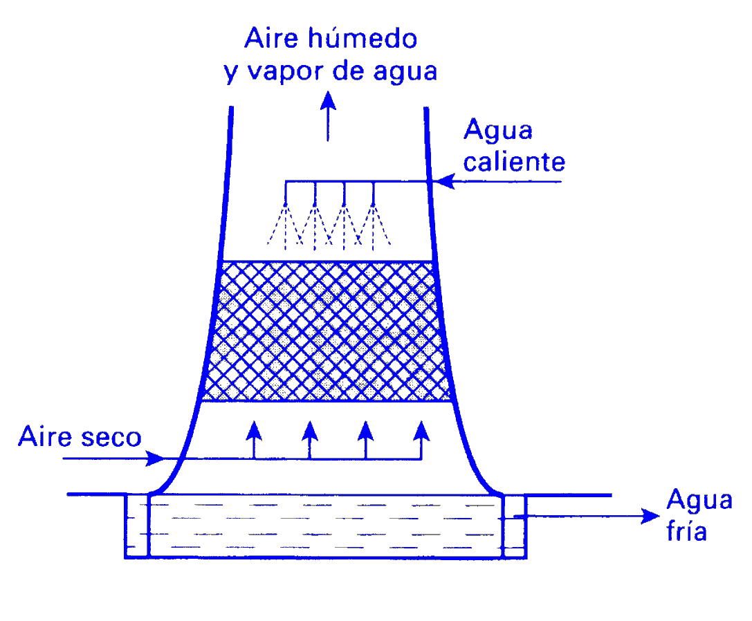 Bajo el punto de vista de los procesos industriales, la faceta más importante de las operaciones de interacción aire-agua es el enfriamiento de agua, que se lleva a cabo en torres de enfriamiento y se utiliza para enfriar grandes volúmenes de agua caliente procedentes de cambiadores de calor. En las torres de enfriamiento, el agua caliente, que se introduce mediante pulverizadores por la parte superior, desciende atravesando el relleno dispuesto en su interior en contracorriente con el aire ascendente y abandona el sistema por su parte inferior. A su vez, el aire asciende por convección natural o forzada (impulsado por una soplante o un ventilador). |