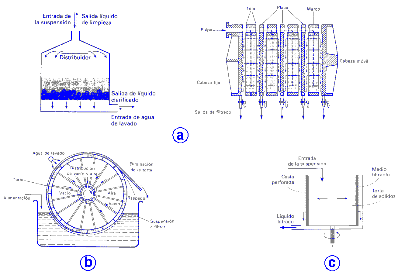Los dispositivos en los que se lleva a cabo la filtración se denominan filtros y el factor más importante en su elección es la resistencia de la torta, ya que el crecimiento de su espesor hace que esa resistencia aumente y, por tanto, ha de establecerse una diferencia de presiones a ambos lados del filtro. Según se aplique la diferencia de presión, los filtros de sólidos suspendidos en líquidos se clasifican en: