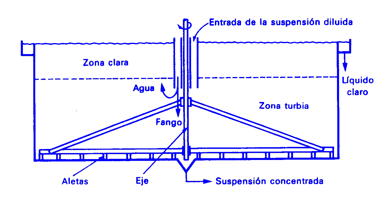 La sedimentación se lleva a cabo en dispositivos denominados sedimentadores, decantadores (si el producto valioso es el líquido) o espesadores (si el producto valioso es el sólido). Un sedimentador continuo consiste en un depósito cilíndrico que suele tener fondo cónico de poca inclinación. La suspensión se alimenta por el centro del sedimentador, a una cierta profundidad por debajo del nivel del líquido y el líquido claro se retira por la parte superior a través de un rebosadero. Para facilitar la separación, estos equipos están dotados de unos rastrillos que giran lentamente, desplazando los sólidos hacia la parte central del fondo, desde donde se retiran mediante una bomba de lodos. |