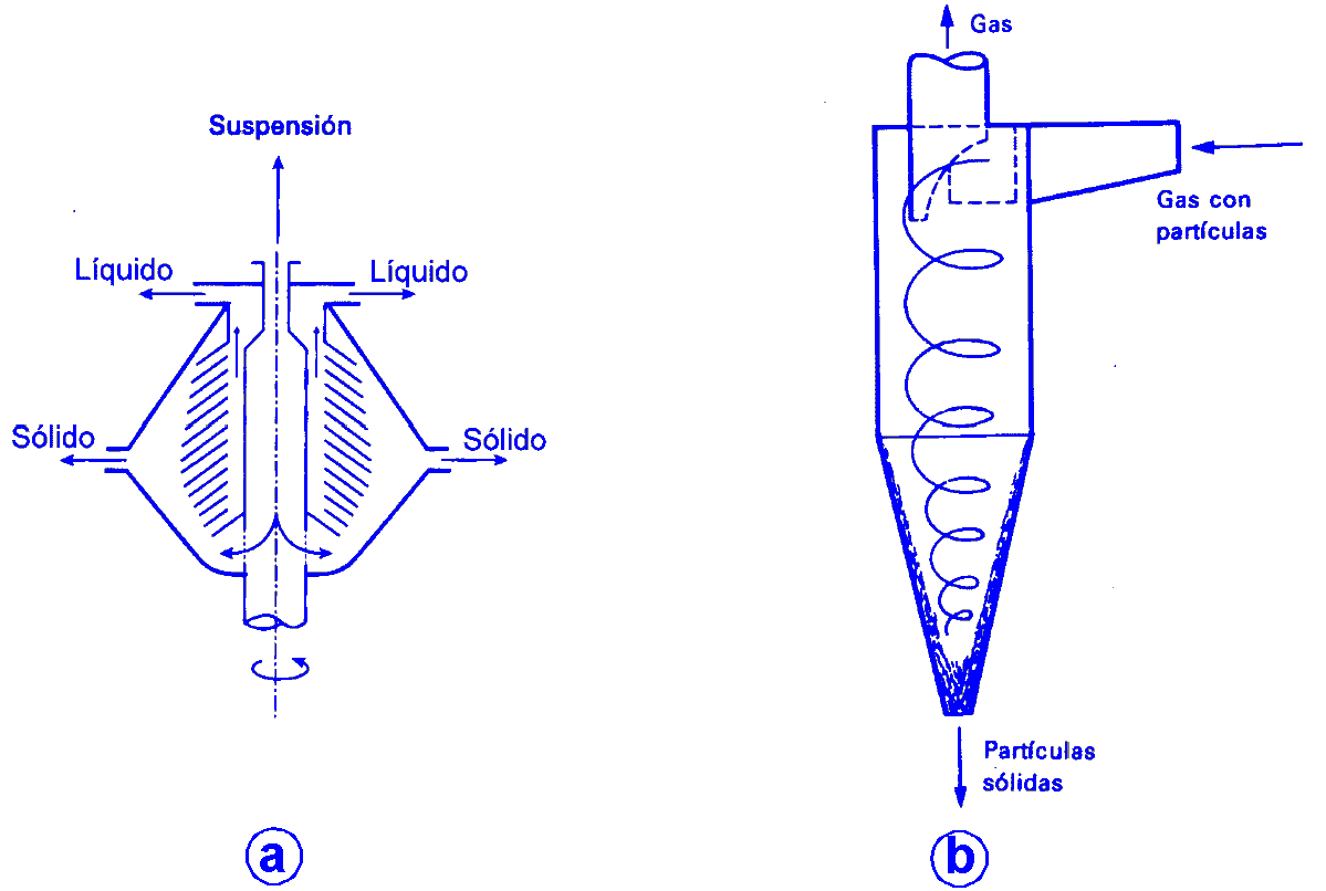 La centrifugación para la separación de sólidos de un líquido se desarrolla en aparatos denominados sedimentadores centrífugos, o simplemente, centrífugas; la centrifugación para la separación de sólidos de un gas se desarrolla en aparatos denominados separadores ciclónicos, o simplemente, ciclones. Las centrífugas más habituales operan de forma continua y disponen de una parte móvil giratoria (rotor), que proporciona la energía de rotación a la suspensión y una parte fija diseñada para guiar y separar las dos fases, densa y ligera, que constituyen las dos corrientes de salida. Los ciclones no tienen partes móviles y se basan en aprovechar la energía cinética de la corriente gaseosa que entra tangencialmente, haciendo que ésta recorra una trayectoria en espiral o hélice, donde la inercia hace desplazarse hacia el exterior a las partículas más densas; en la parte cónica inferior se recogen los sólidos y el gas sale por la parte superior. |