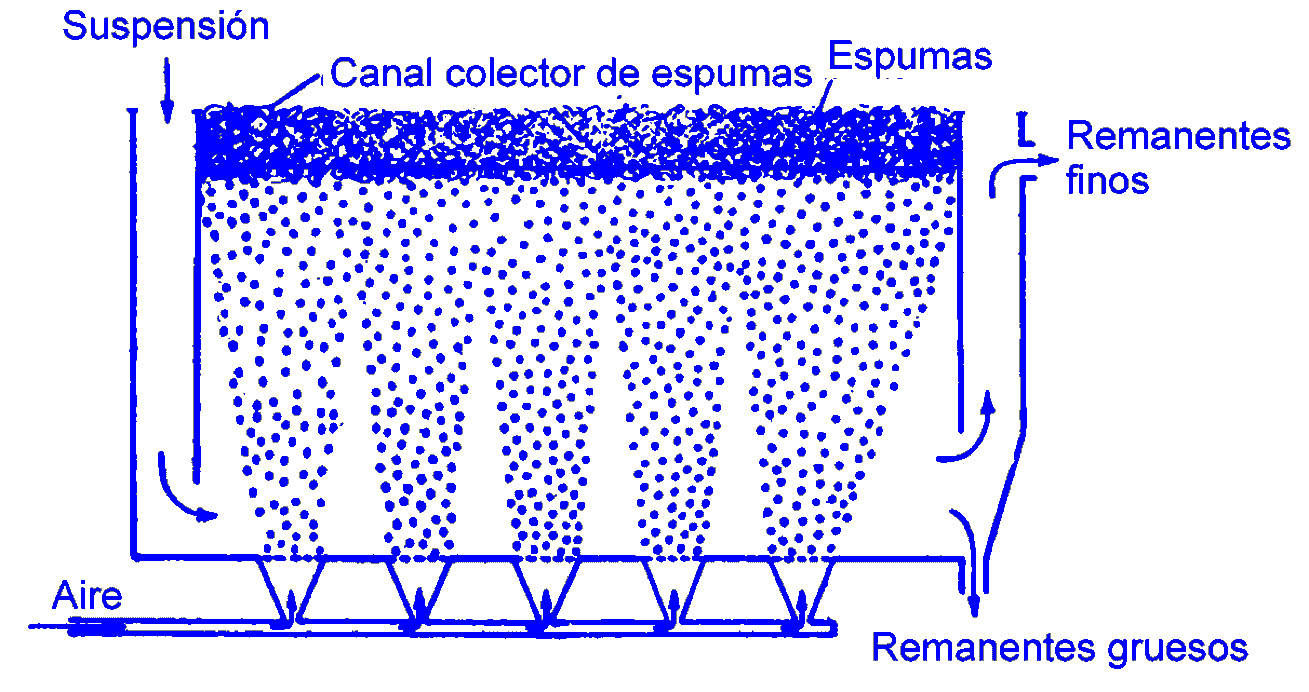 La flotación se lleva a cabo en grandes recipientes abiertos denominados células de flotación, en los que penetra por su parte inferior una corriente de aire muy subdividida. La entrada de la suspensión es continua y en la mayoría de los casos el aire se inyecta a presión (células neumáticas). En las células neumáticas de flotación la suspensión penetra por un extremo del tanque, atravesándolo longitudinalmente; en su recorrido la suspensión encuentra una corriente ascendente de burbujas de aire que arrastra las partículas, formando la espuma, que se retira por la parte superior, y mantiene el baño en continua agitación. |