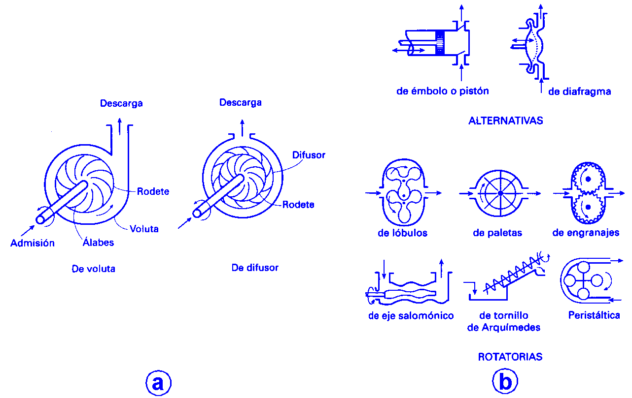 Impulsión de líquidos (Figura V.16): Los aparatos utilizados para la impulsión de líquidos se denominan bombas, que presentan en cada caso unas características determinadas, como su capacidad (caudal que pueden suministrar) y su carga (altura a la que pueden impulsar un líquido). Pueden distinguirse dos tipos principales de bombas: