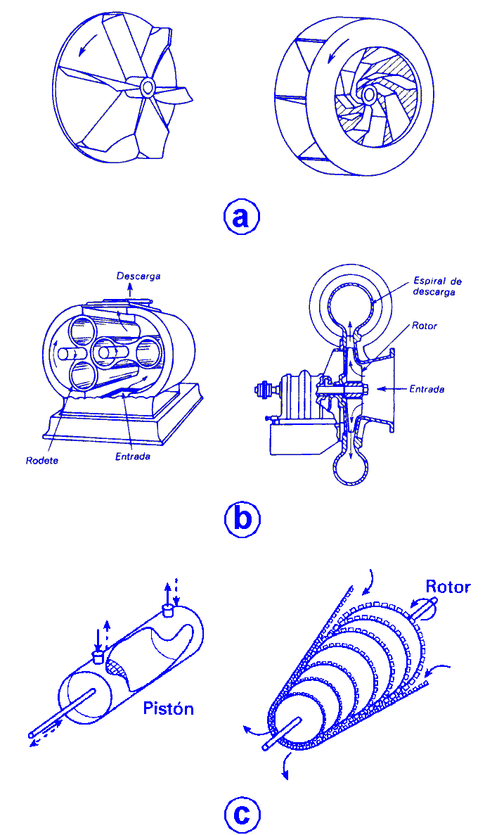 Los aparatos utilizados para impulsar gases se clasifican según el intervalo de aumento de presión que pueden producir; las presiones más altas pueden conseguirse con más de una etapa de operación. Cabe distinguir entre los tres tipos principales de dispositivos: