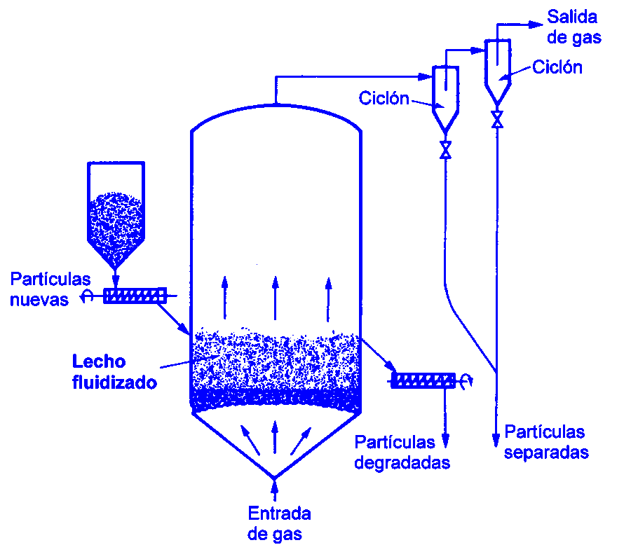 La fluidización se aplica a escala industrial a numerosos procesos, ya que la utilización de lechos fluidizados permite un elevado grado de mezcla, mayor facilidad de operación en continuo y un volumen más reducido para una capacidad de tratamiento determinada En una instalación típica que opera en lecho fluidizado, las condiciones de fluidización se mantienen por acción de una corriente de gas. Las partículas que se van degradando se eliminan y son sustituidas simultáneamente por partículas nuevas. El gas que abandona el lecho puede arrastrar pequeñas partículas que se separan mediante sedimentadores (ciclones). |