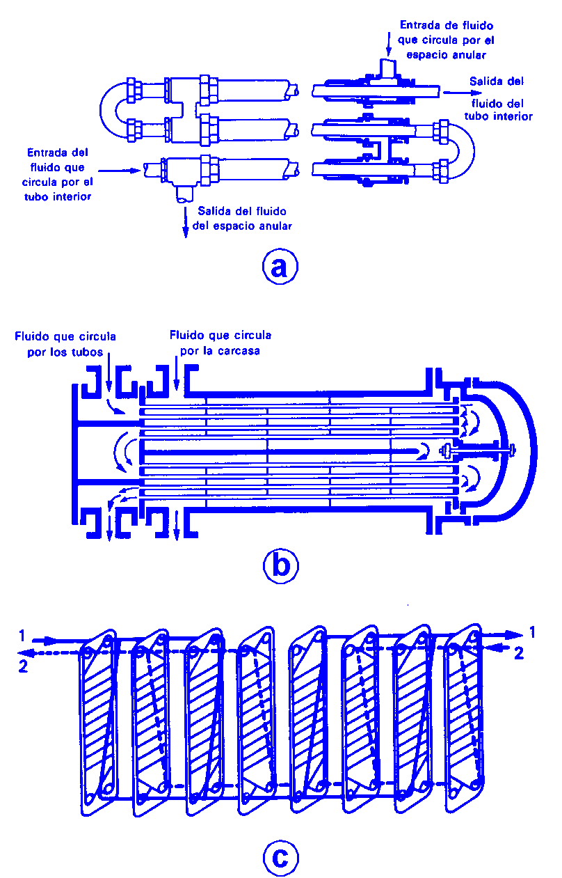 Intercambio de calor sin cambio de fase (Figura V.20): Los equipos donde se intercambia calor entre fluidos sin que se produzca cambio de fase se denominan cambiadores de calor y son unos de los dispositivos más utilizados en los procesos químicos, donde siempre es necesario proporcionar a las distintas corrientes sus niveles térmicos adecuados, además de intentar conseguir el máximo ahorro de energía. Los tipos de cambiadores de calor mas utilizados son los siguientes: