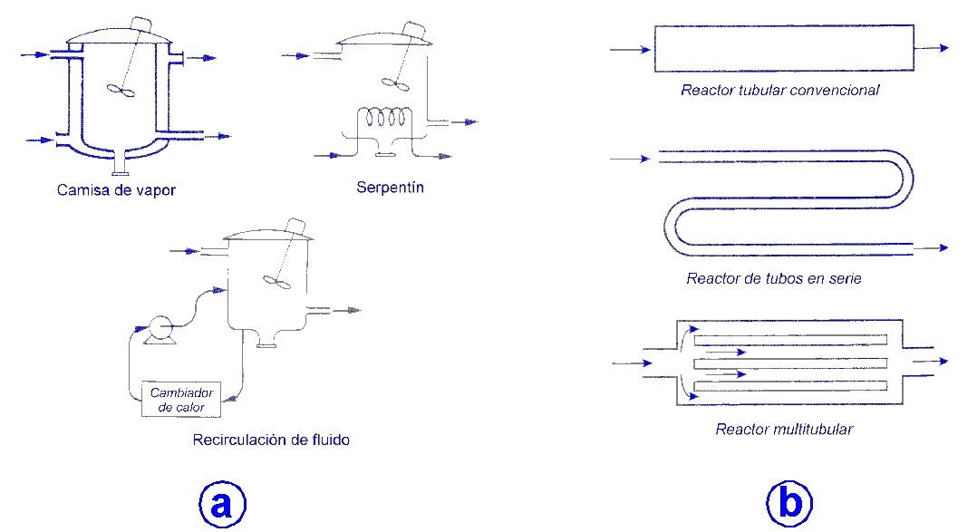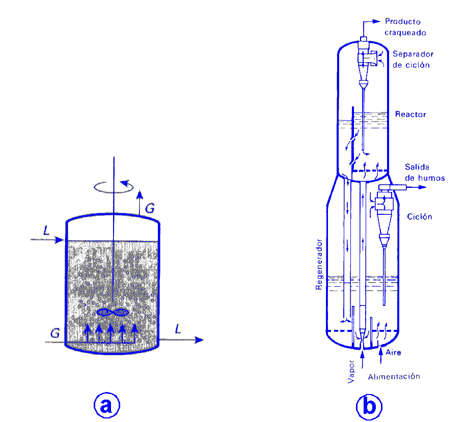 Reacciones homogéneas (Figura V.21): Las reacciones homogéneas transcurren en una sola fase y para conseguir las condiciones que permitan a la reacción transcurrir con la velocidad y en el grado deseados se suelen diseñar los dispositivos para que su comportamiento se acerque lo más posible a los modelos ideales de flujo: mezcla perfecta y flujo en pistón. Los reactores que mejor se ajustan a los modelos de flujo mencionados son: