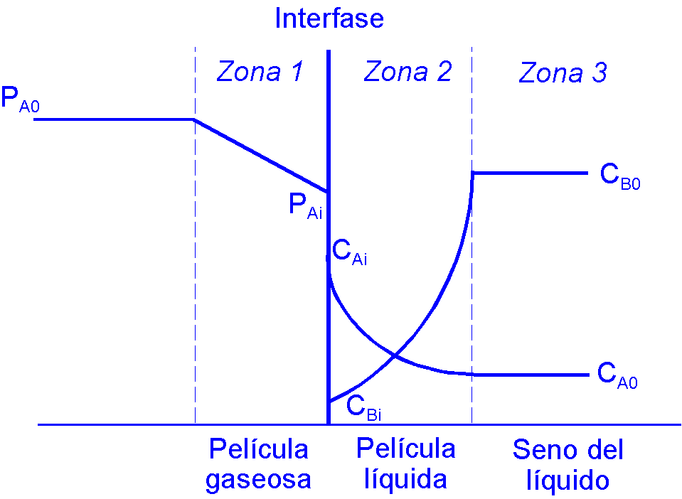 En la velocidad global intervendrán las resistencias a la transferencia de materia; se utilizará la teoría de la doble película (Lewis y Whitman, 1924) que afirma que la resistencia está concentrada en sendas películas en reposo adyacentes a la interfase, de espesor: