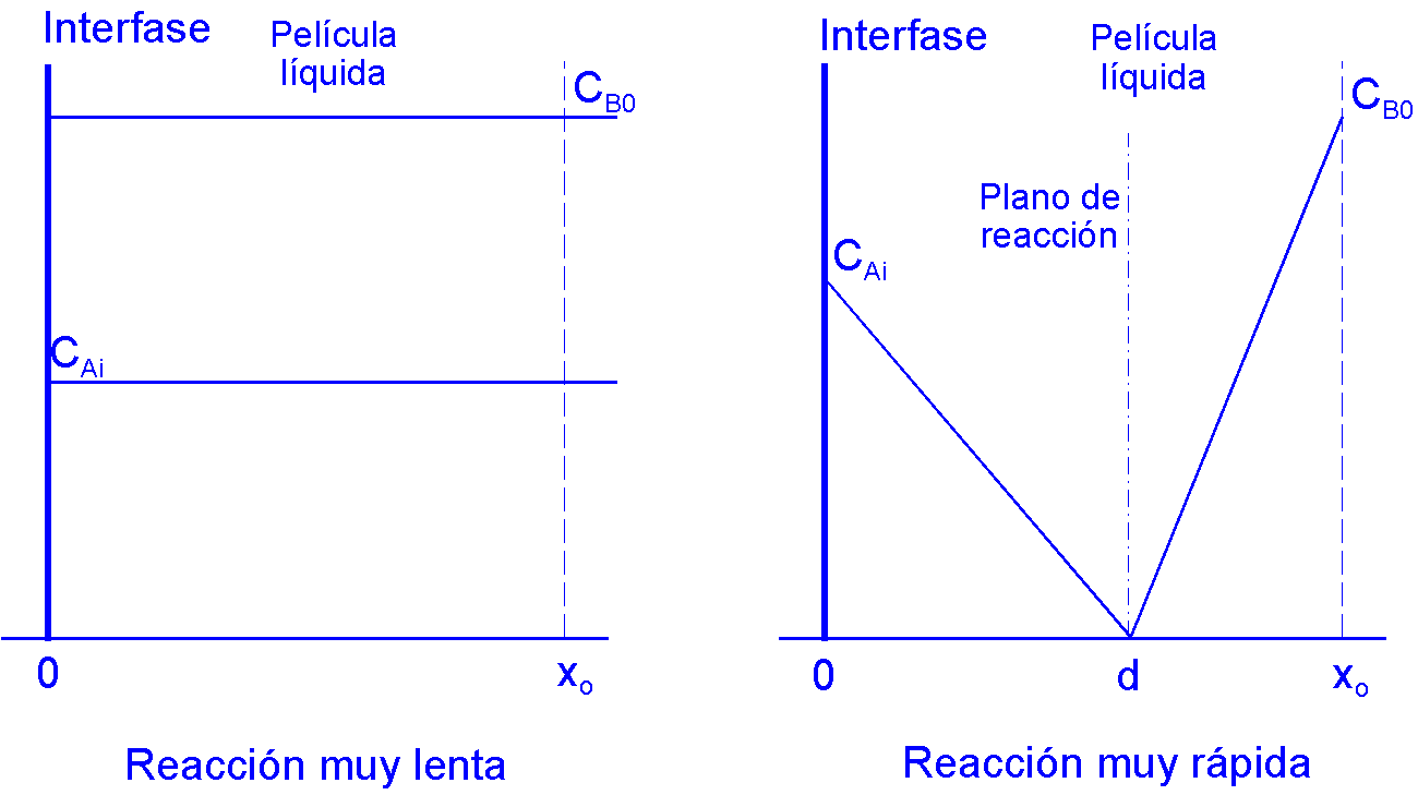 Para evaluar el factor de aceleración suelen definirse dos parámetros adimensionales que relacionan la densidad de flujo de A con reacción química y la densidad de flujo de A sólo por difusión. La densidad de flujo de materia por difusión se calcula mediante Para analizar la reacción química en la película líquida se usan dos referencias extremas: Reacción muy lenta y reacción muy rápida (instantánea); sus perfiles de concentración se muestran en la Figura VII.2, VII.3): |