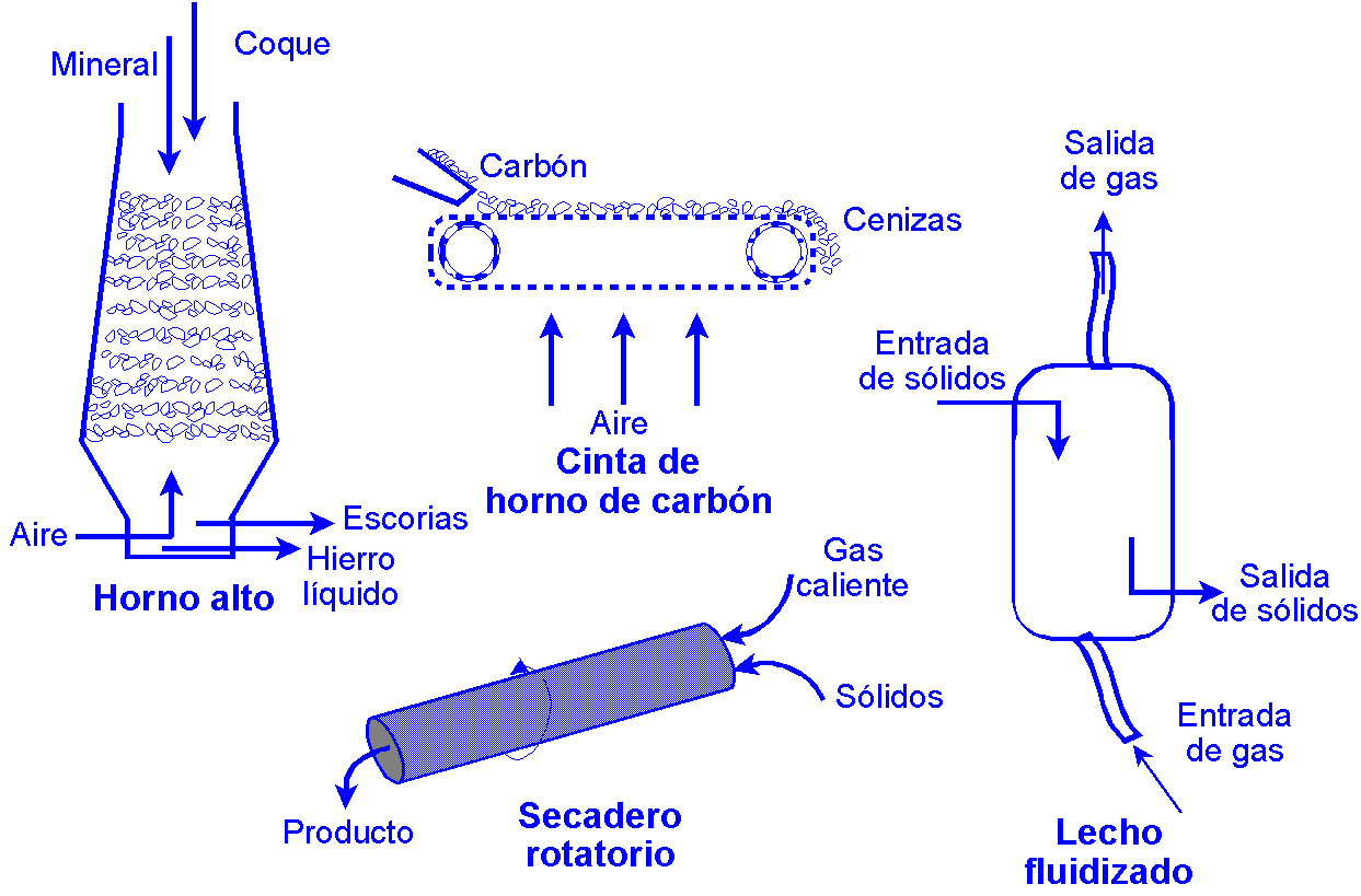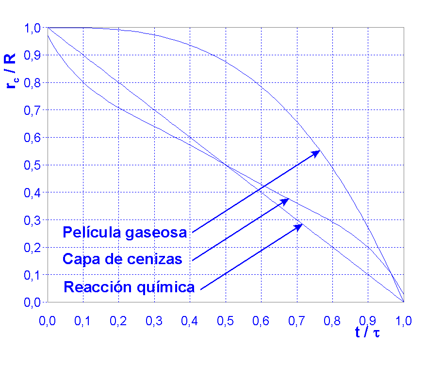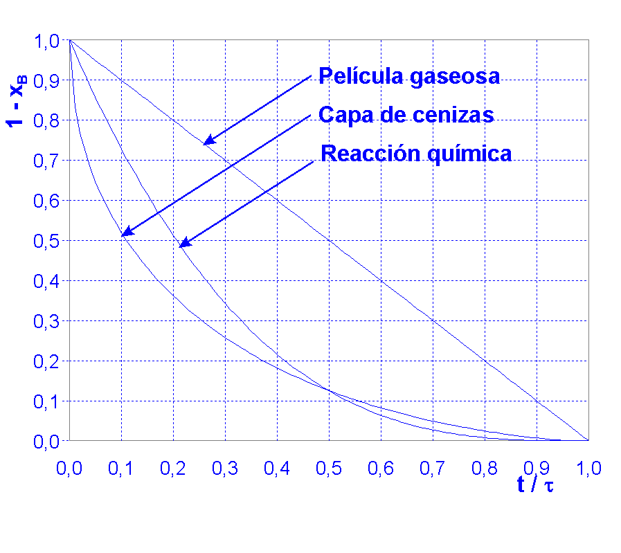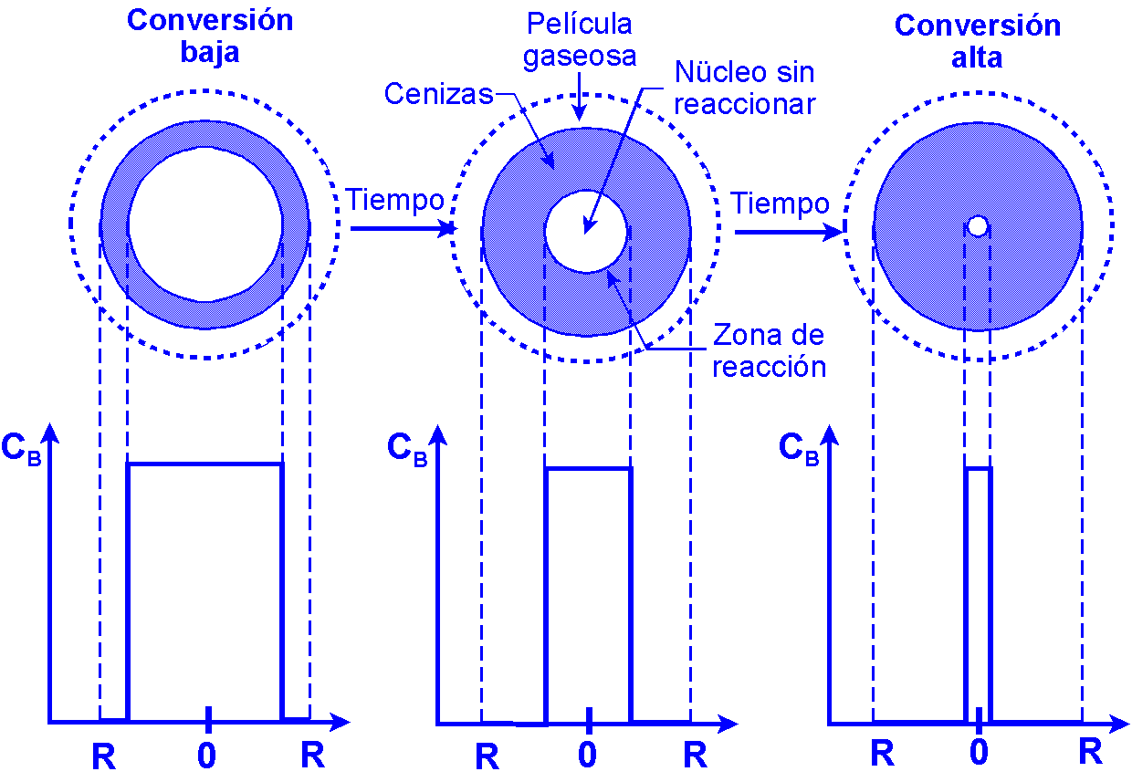 Reacciones fluido-sólido: Generalmente gas-sólido; el tamaño de las partículas puede permanecer constante (capa de cenizas) o disminuir durante la reacción (productos fluidos o cenizas no adherentes). Velocidad de reacción: Modo de contacto entre las fases, transporte de materia en cada una de las fases. Modelo cinético: Sistema gas-sólido gon un reactivo A gaseoso y un reactivo B sólido (reactivo limitante) que reacciona según la estequiometría: