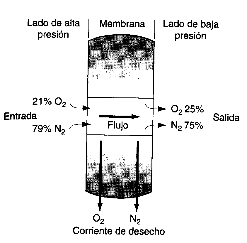 Las membranas representan una tecnología relativamente nueva para separar gases. Una aplicación que ha llamado la atención es la separación de oxígeno y nitrógeno del aire. La Figura ilustra una membrana con poros del orden de 10-9 m que se fabrica aplicando un recubrimiento muy delgado de polímero a una capa de soporte de grafito poroso.