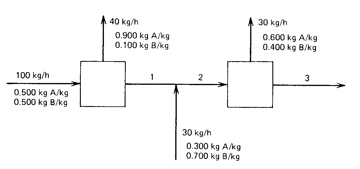En la Figura se muestra el diagrama de flujo para un proceso de destilación continua en régimen estacionario de dos unidades. Cada flujo contiene dos componentes, A y B, en diferentes proporciones. Los tres flujos cuyas velocidades de flujo y/o composiciones se desconocen, están etiquetados con los números 1, 2 y 3.