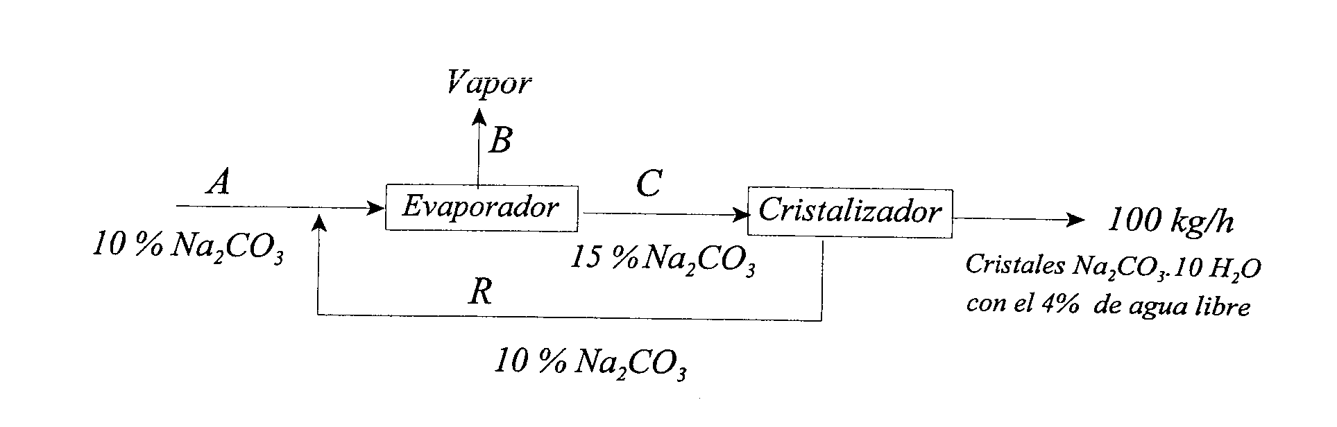 Se desea obtener carbonato sódico cristalizado (Na2CO3ˇ10H2O) a partir de una disolución acuosa de Na2CO3 al 10% en peso. El proceso a seguir utiliza un evaporador y luego un cristalizador, tal como se indica en el esquema de la Figura.