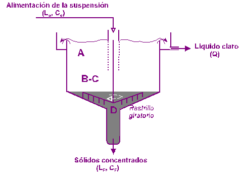 En los sedimentadores continuos pueden distinguirse zonas de clarificación, sedimentación y de compresión, como se muestra en la figura siguiente: