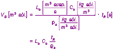 El volumen ocupado por los sólidos se podrá calcular como el producto del caudal volumétrico de sólidos y el tiempo de permanencia (o tiempo de residencia) de los mismos en el sedimentador (ya que no salen sólidos por el rebosadero), que será aquél en que la concentración de la suspensión alcance el valor establecido por diseño para el lodo:
