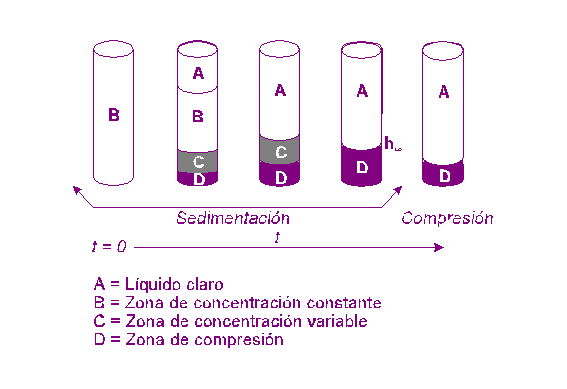 Al comienzo del ensayo de sedimentación todas las partículas descienden en sedimentación libre y velocidad constante en la zona (B) de la suspensión, cuya concentración de sólidos es también constante. Por encima de esta zona aparece una zona (A), de líquido claro. A lo largo del ensayo la altura h del límite de separación del liquido claro (A) y la zona de sólidos suspendidos (B), disminuye a velocidad constante y en el fondo de la probeta aparece una nueva zona (D), que contiene las partículas sedimentadas, al tiempo que entre las zonas (B) y (D) surge una zona de transición (C) cuyo contenido en sólidos varía entre el que existe en la zona (B) hasta el que hay en la zona (D).