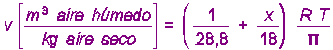 El volumen específico del aire húmedo, v, se define como el volumen total que ocupa la unidad de masa de aire seco y el valor de agua que la acompaña (considerando comportamiento de gas ideal):