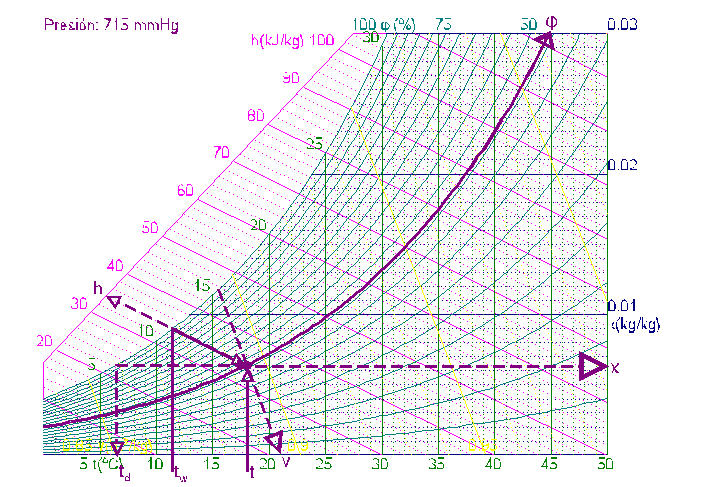 El diagrama psicrométrico adjunto , obtenido a 715 mmHg puede utilizarse para obtener gráficamente las propiedades del aire húmedo.