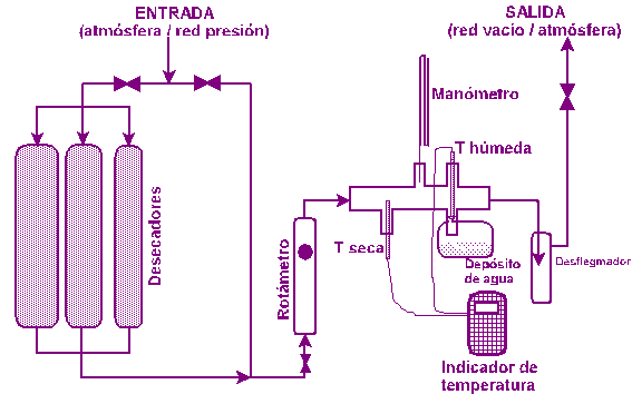 A continuación del termómetro húmedo se ha colocado un desflegmador, que actuará como trampa para las gotas de agua que puedan ser arrastradas por la corriente de aire, procedentes del depósito de alimentación del termómetro húmedo.